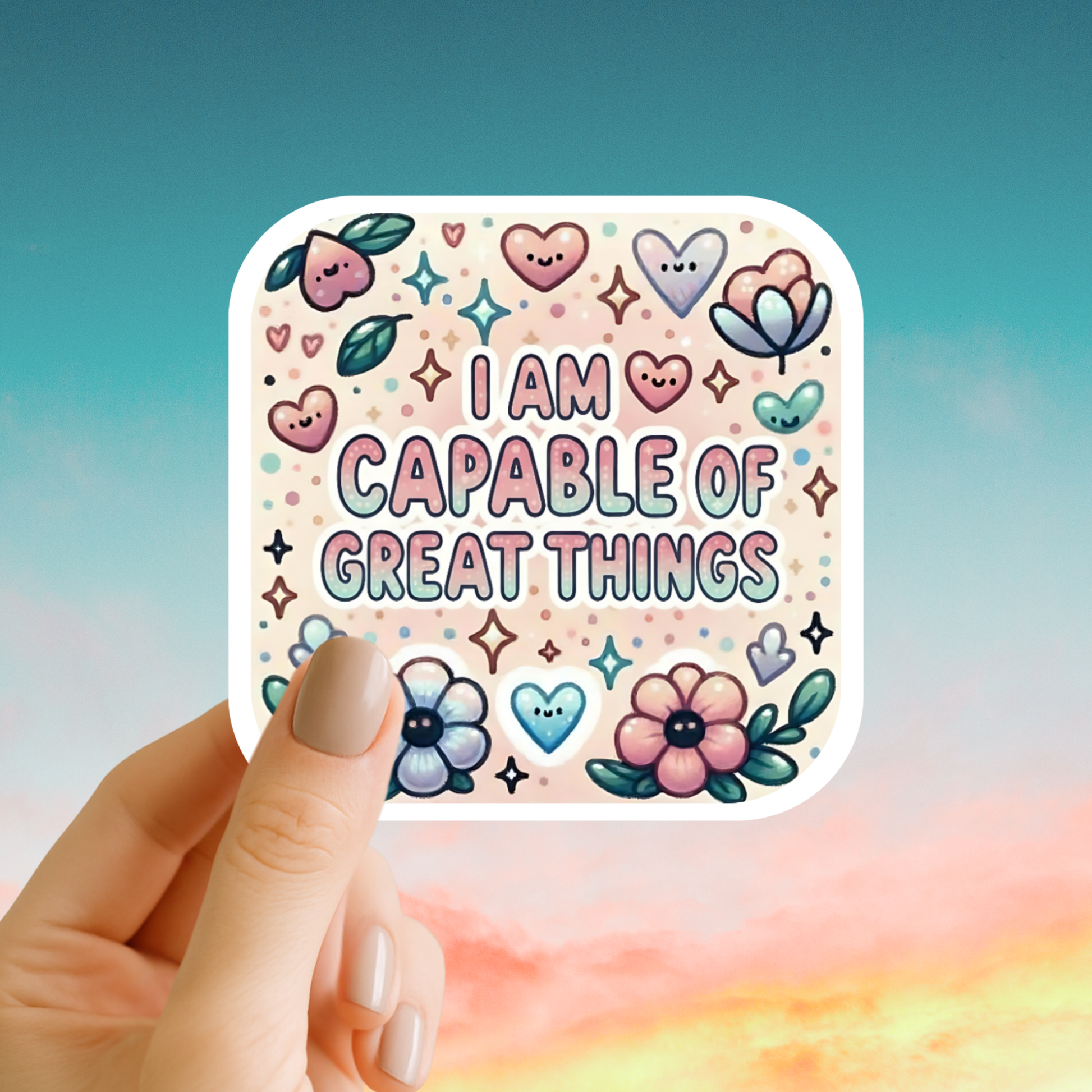Daily encouragement you can take anywhere. I am capable of great things affirmation sticker in durable waterproof vinyl.